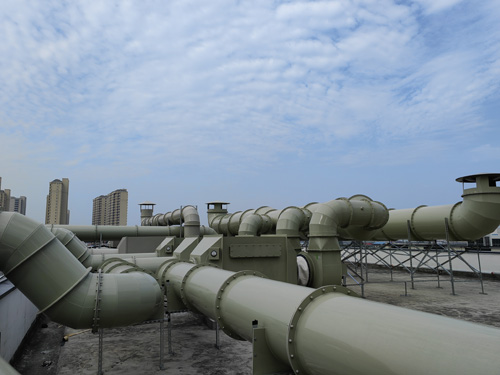 試驗室有機廢氣 → 特異性炭過濾裝置器 → 引高壓離心風機 → 減排